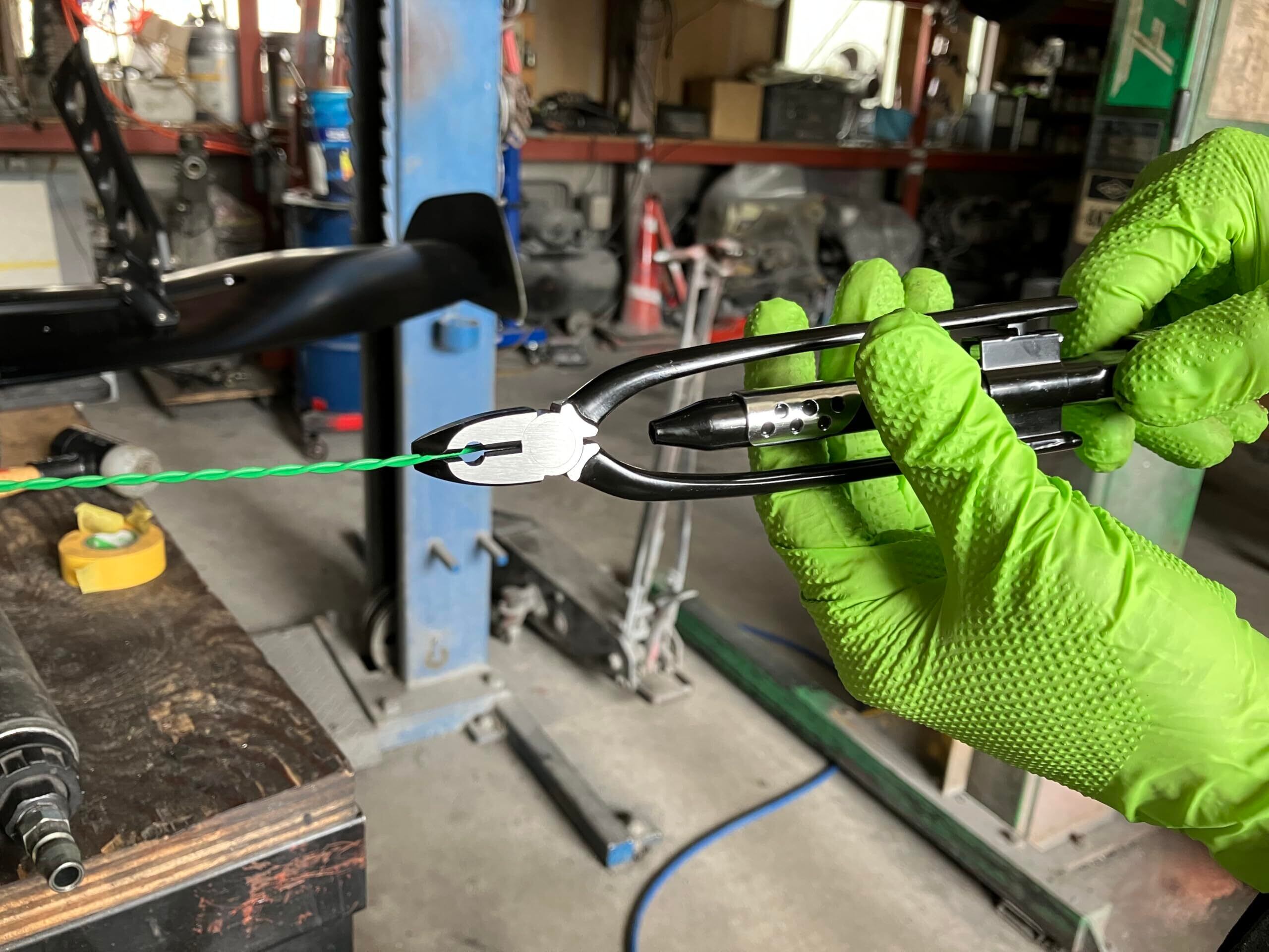 ●便利なオートリターン式:先端で2本のワイヤーをつかみ、後部ノブを引くことで本体が回転する。