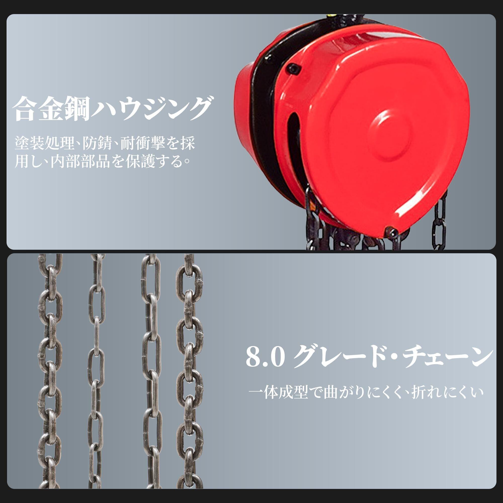 ダブルブレーキ機構:高耐久G80チェーンとダブルブレーキ機構を採用。重量物吊り下げ時の安全性を徹底追求。突然の荷崩れを防止し、倉庫や工場の過酷な作業環境でも安定した性能を発揮します