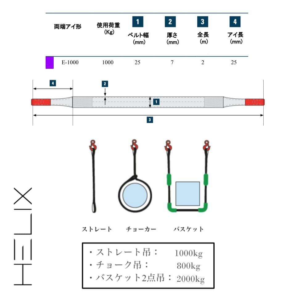 HELIX スリングベルト 幅25mm 使用荷重1000kg ナイロンスリング 吊上げ 牽引 ベルトスリング 1T 日本語仕様書付【2本セット】 (2m)
