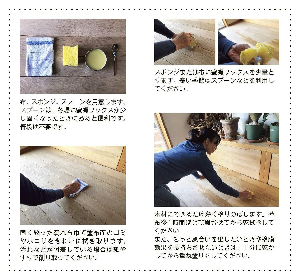 長野、岐阜、北海道で採れた国産蜜蝋、亜麻仁油、杉エキスによる100%天然素材で製造した蜜蝋ワックスです。小さいお子様がいるご家庭でも安心してお使いいただけます。