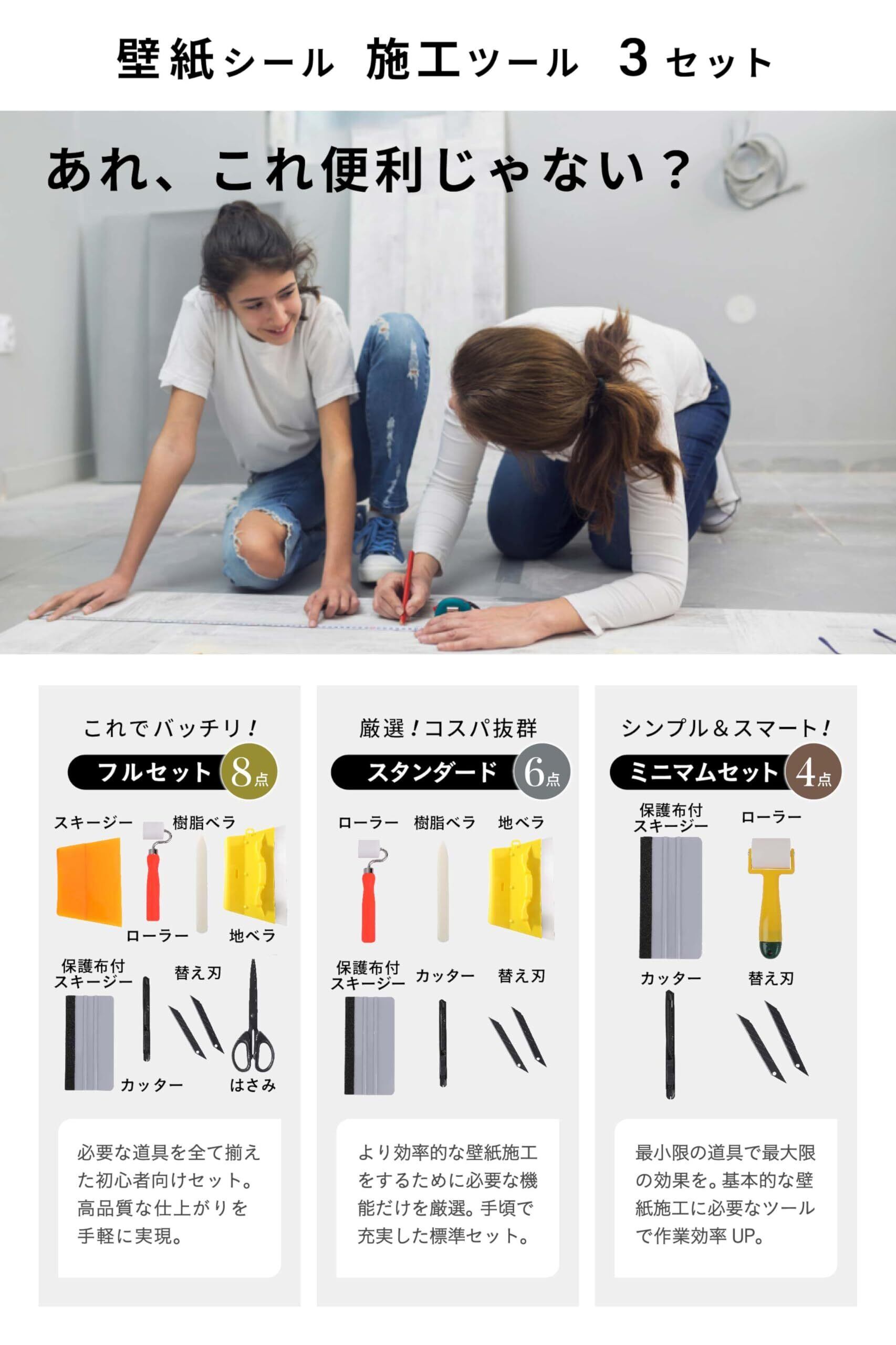 【選べる3タイプのセットをご用意】A-Gloss Homeの選べる壁紙施工ツールセット、3つのバリエーションでご用意しました!「8点フルセット」は初心者でも簡単に高品質な仕上がりを実現。「6点スタンダードセット」は効率的な施工のための厳選ツールを集約。「4点ミニマムセット」はシンプルで使いやすく、持ち運びにも便利。あなたならどれを選ぶ?