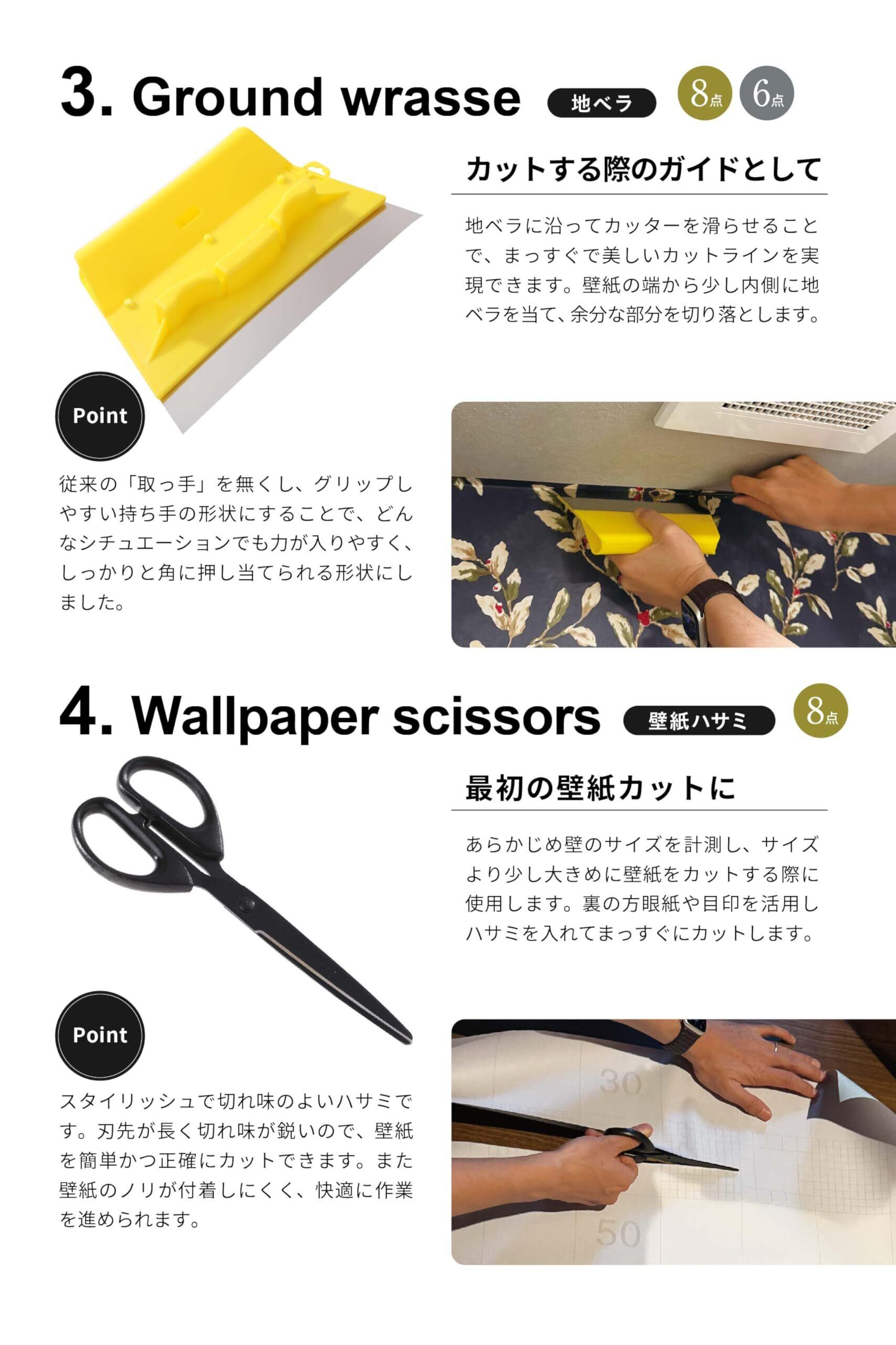 【8点フルセット】必要な道具を全て揃えたフルセット!初心者でも扱いやすく、高品質な仕上りを実現。 セット内容:1.ジョイントローラー(大) 2.壁紙カッター 3.替え刃 4.地ベラ 5.樹脂べら 6.保護布付きスキージー 7.キージー 8.壁紙ハサミ