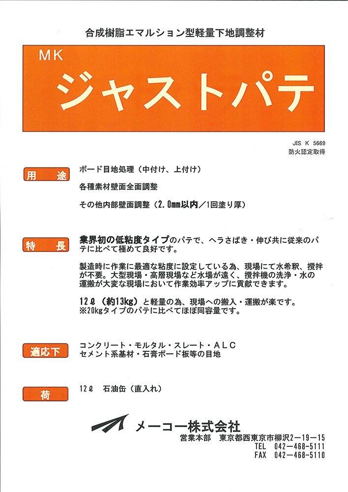 メーコーのECOジャストパテは、軽量骨材配合による中・上付け用パテです。