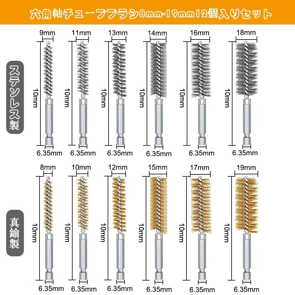 Kimlonton 六角軸チューブブラシ 電動ドリル用研磨ブラシ ワイヤーブラシ ステンレスと真鍮製 Φ8mm Φ9mm Φ10mm Φ11mm Φ12mm Φ13mm Φ14mm Φ15mm Φ16mm Φ17mm Φ18mm Φ19mm 12個入りセット 清掃や錆除去に ロータリーツール