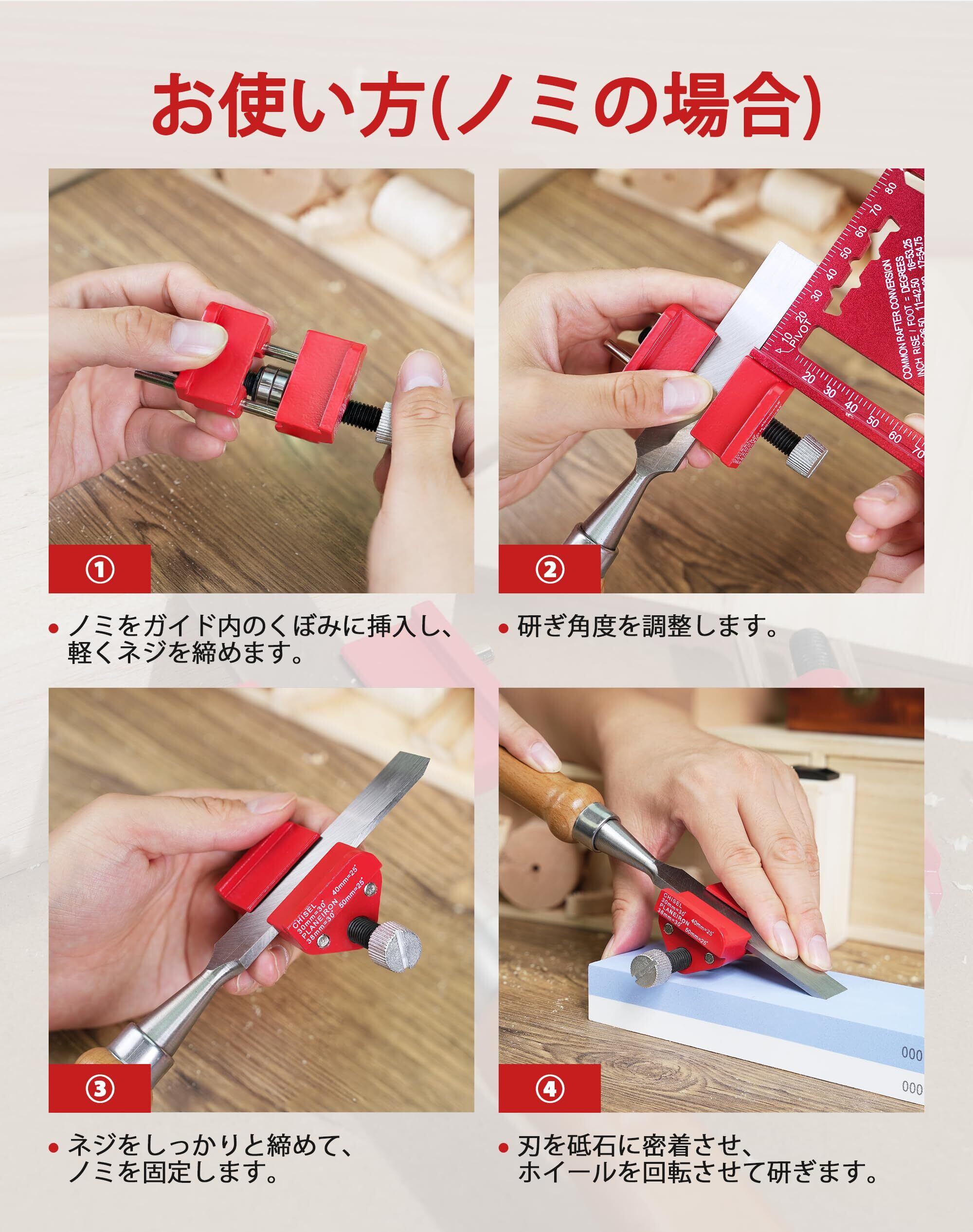 【操作流れ】①ノミをガイド内のくぼみに挿入し、軽くネジを締めます。②研ぎ角度を調整します。③ネジをしっかりと締めて、ノミを固定します。④刃を砥石に密着させ、ホイールを回転させて研ぎます。