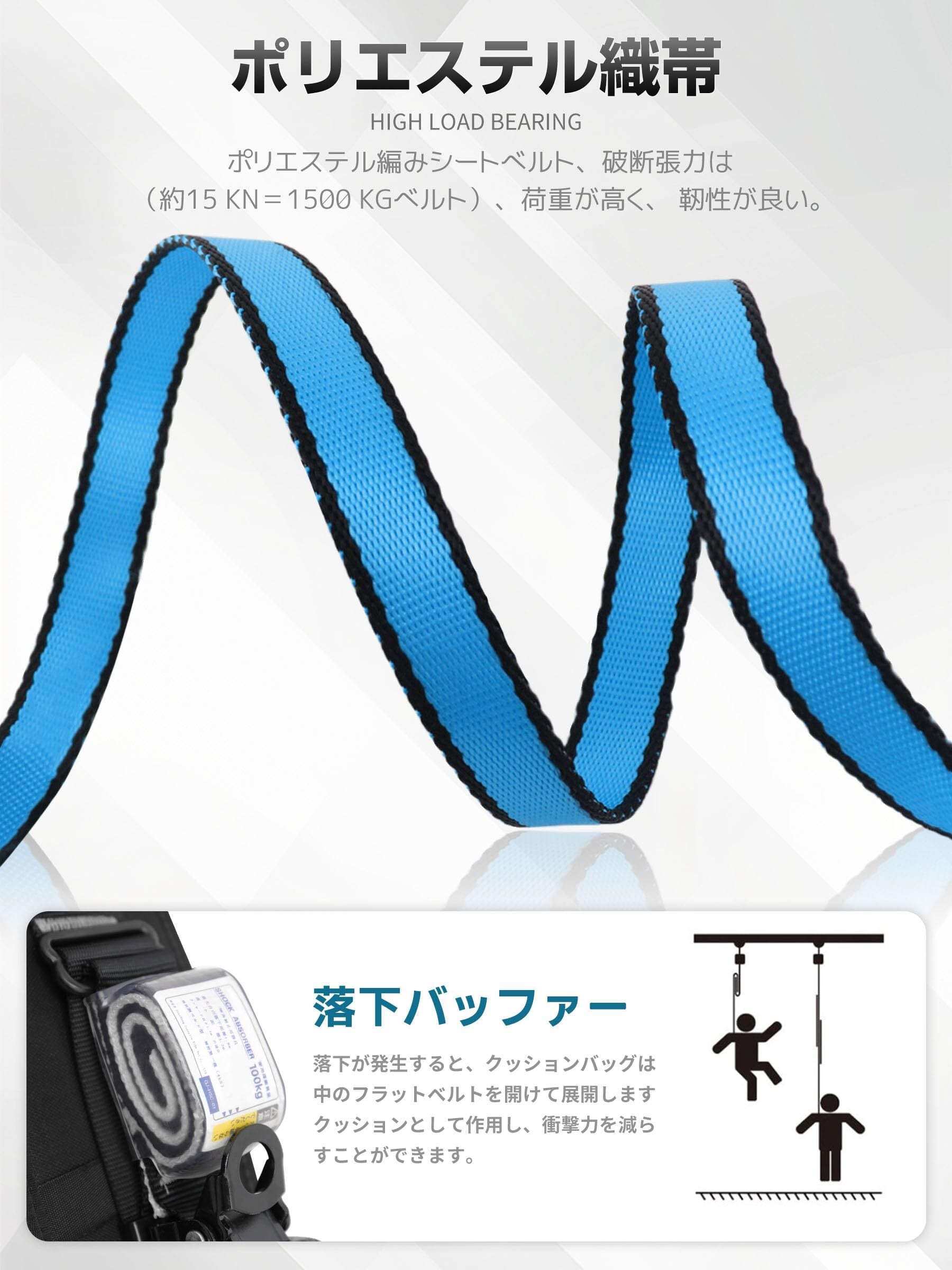 【高品質素材の新基準腰ベルト】新規格 胴ベルト型安全帯は高強度ポリエステル素材でできており、引張力は1600kgです。耐荷重性、耐摩耗性、耐久性、耐食性などに優れており、作業者の安全を確保します。巻取り器のフックも誤操作を防止するように設計されており、安全スイッチを押さないと内側から開くことはできません。