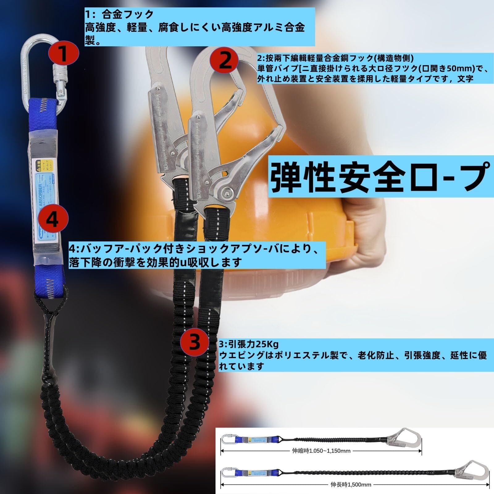 【フルハーネス 新規格適合】:合金鋼フック+高強度ポリエステル弾性ロープ、全身ベルト式シートベルト、強度ポリエステルウェビング 耐腐食性、耐摩耗性、引張強度に優れ、耐荷重と安全性をより確実にしています。損傷や胸部等の圧迫による危険性の指摘があり胴ベルト型に比べて,フルハーネス型は万一の墜落時に複数個所で作業者の身体を支え、衝撃荷重分散して緩和する構造となっており「より安全性が高い安全帯(墜落制止用器具)といえます。