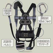 【フルセット】 フルハーネス、蛇腹ダブルランヤード(2丁掛け)、胴ベルト/胴当てベルト、肩 . 背中 クッションパッド、完璧なフルセット