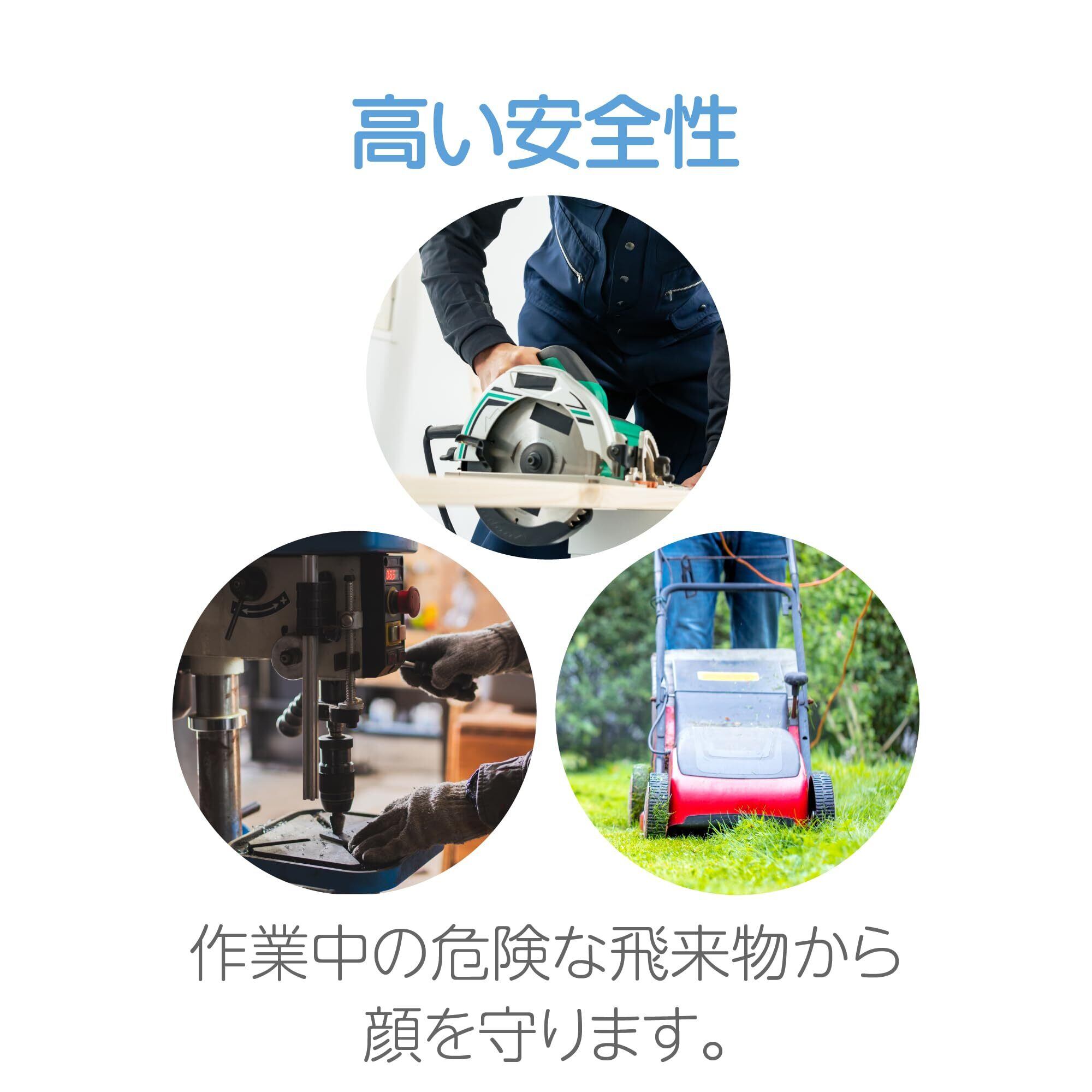 【高い安全性】 耐衝撃性に優れたポリカーボネートレンズを使用しており、作業中の危険な飛来物から顔を守ります。厚さ3mmのシールドは耐久性と耐熱性を備え、透明度が高いため、作業中の視界を確保しながら保護します。