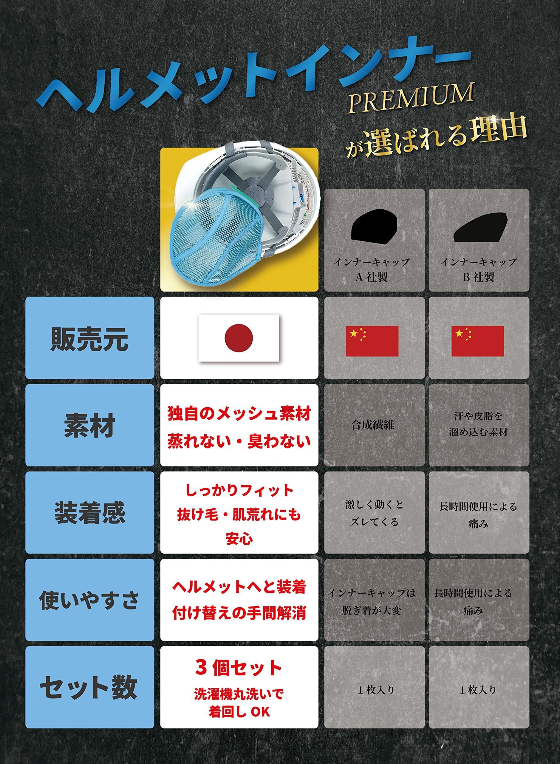 ヘルメットの内側に装着することで、通気性や吸水性を改善します。 夏場の熱中症対策にお役立て下さい。 3枚セットなので洗濯して繰り返し使うことができます。