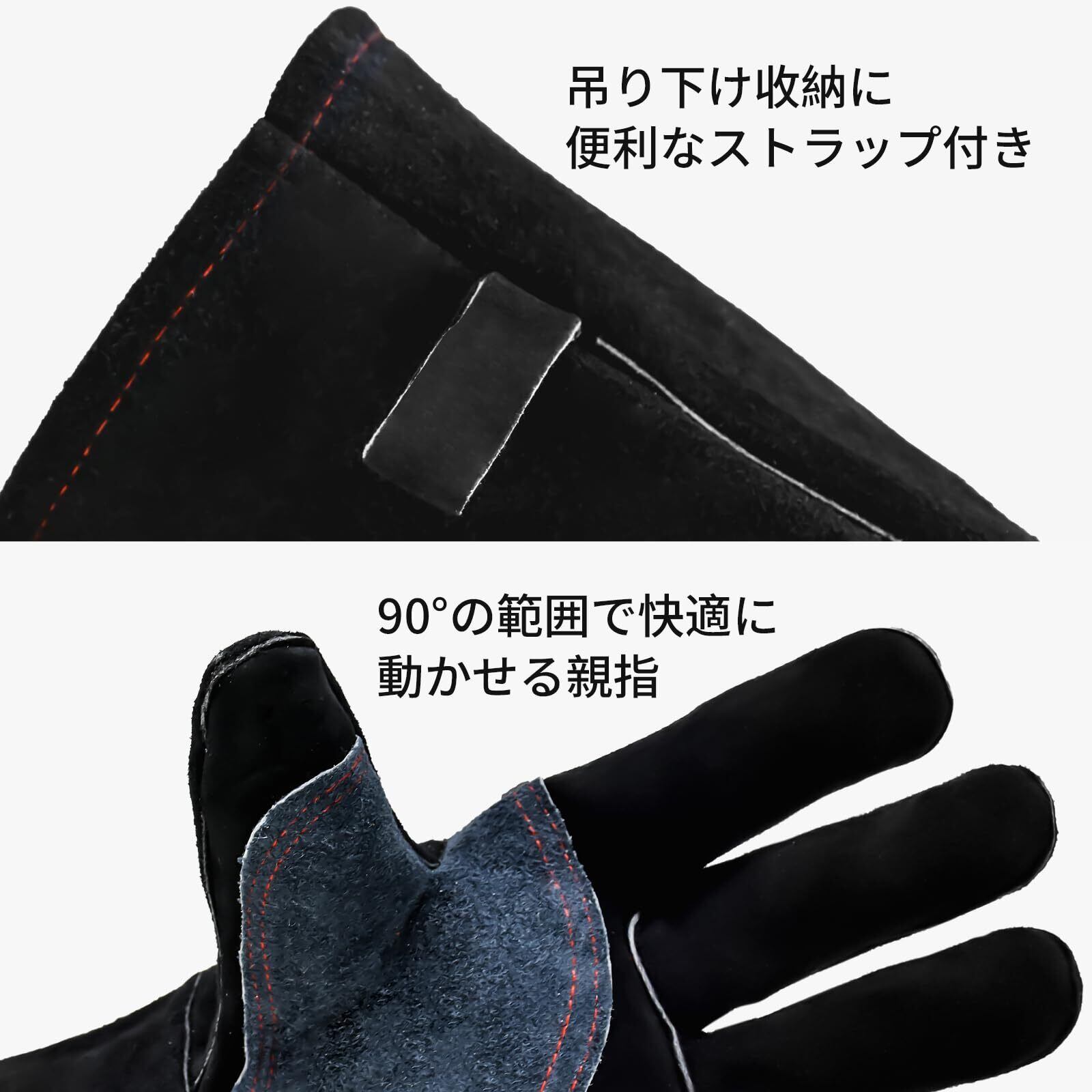 【製品仕様】耐熱手袋は全体に牛革・難燃性素材・綿布の三層構造になっています。サイズ:フリー(長約36CM、幅約18cm)男女兼用。
