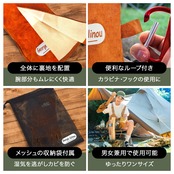 【使い勝手抜群の形状】 本体は長さ35cmと長め丈なので、火の粉や炎から手首上までをしっかり保護できます。 間口が広いため脱着も簡単◎アウターの袖もそのままスムーズに収まります。 カラビナやフック用のループもアウトドアシーンでは役立つポイントです。 グローブには専用の収納袋を付属しており、保管や持ち運びに便利です。 袋はメッシュ素材なので湿気を逃がし、本体にカビが発生することを防ぎます。