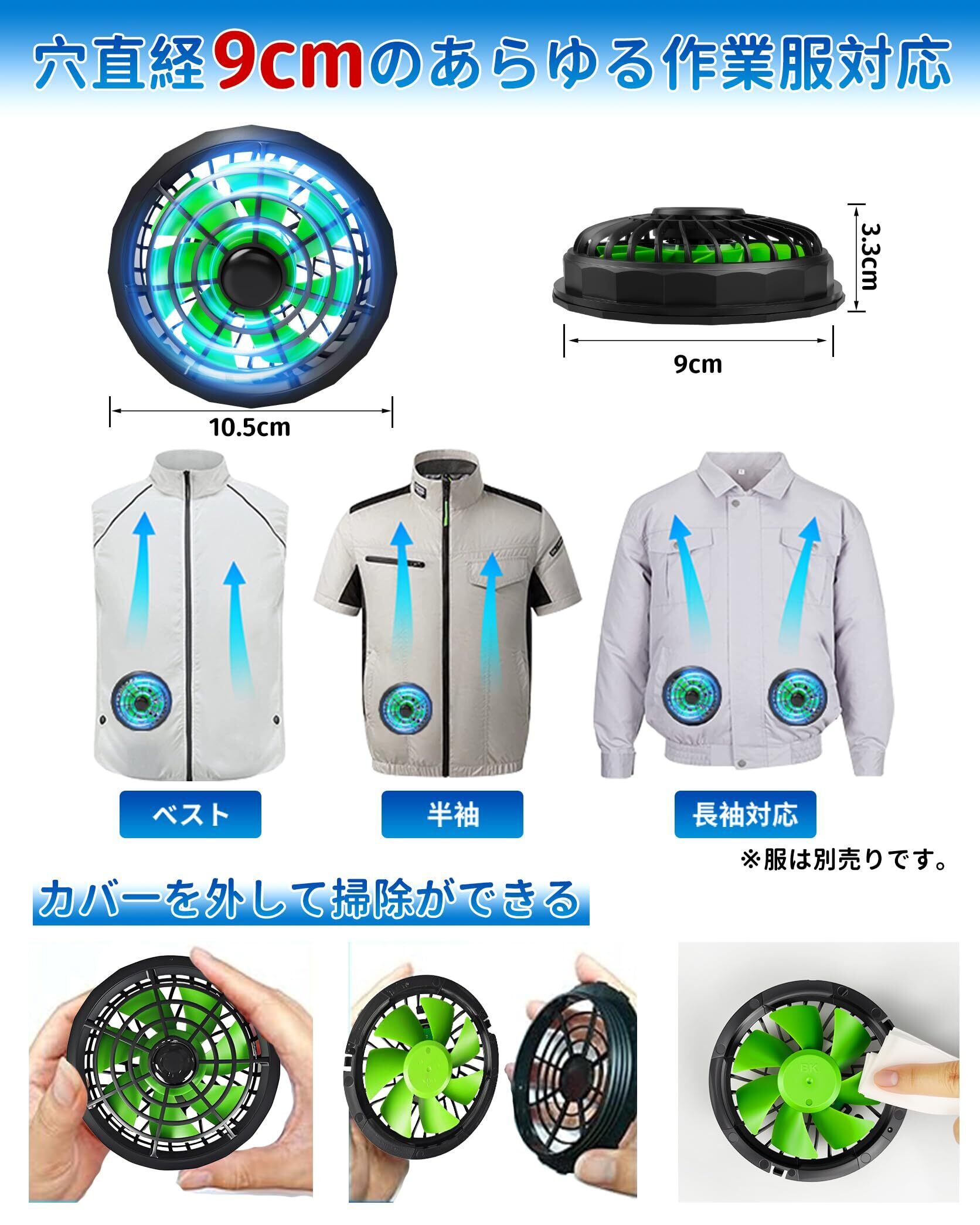 空調作業服 ファン 5V-7.4V 大風量 薄型 USBケーブル付 冷却服ファン ブラシレスモーター 取り外し可能 空調作業ベスト/半袖/長袖対応 熱中症対策 暑さ対策グッズ 穴直径9cmのあらゆる作業服適用