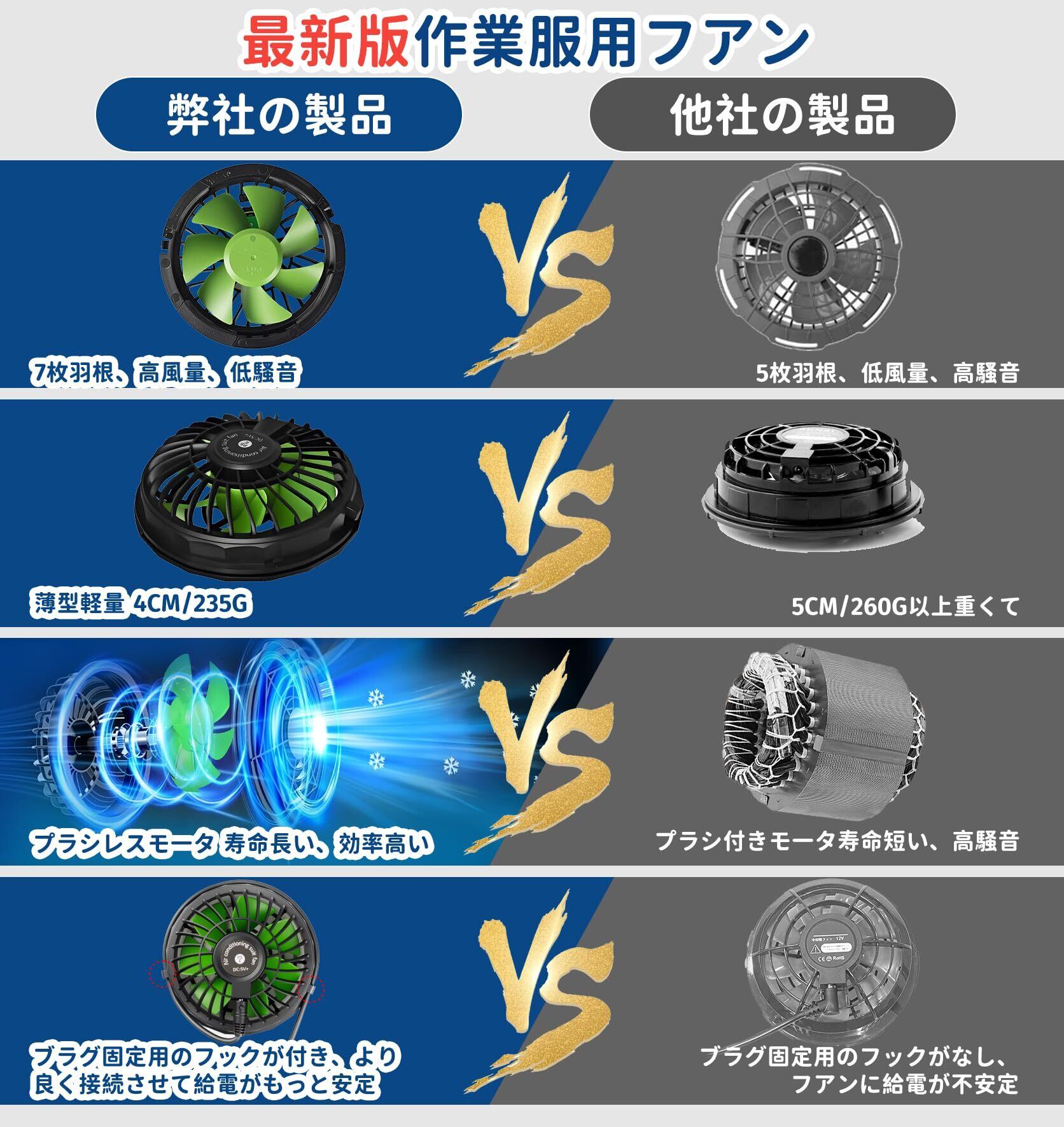 当社のファンは5V-7.4V高出力のUSB給電タイプを採用し、風速は従来の5V出力のUSBファンより40%を増やします。40℃の猛暑日でも服内が猛暑知らず楽にすごせます。フル充電後、最小風量で約10時間の連続使用可能です。1日中の作業でも十分対応可能、夏の屋外作業に欠かせない作業服ファンです。(※作業服・バッテリーは付属致しませんのでこ注意下さい)