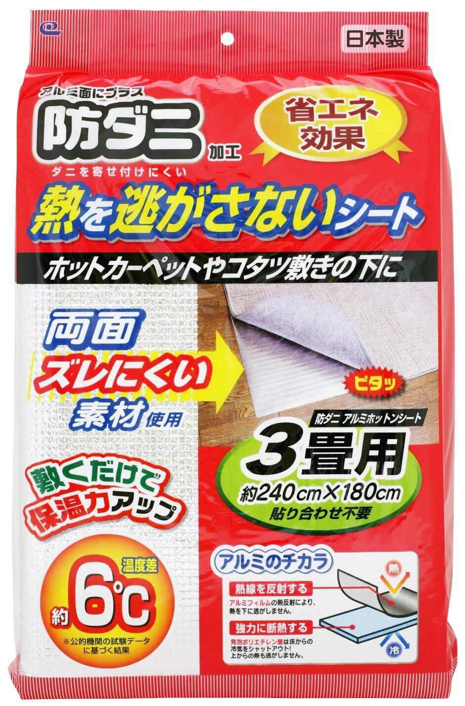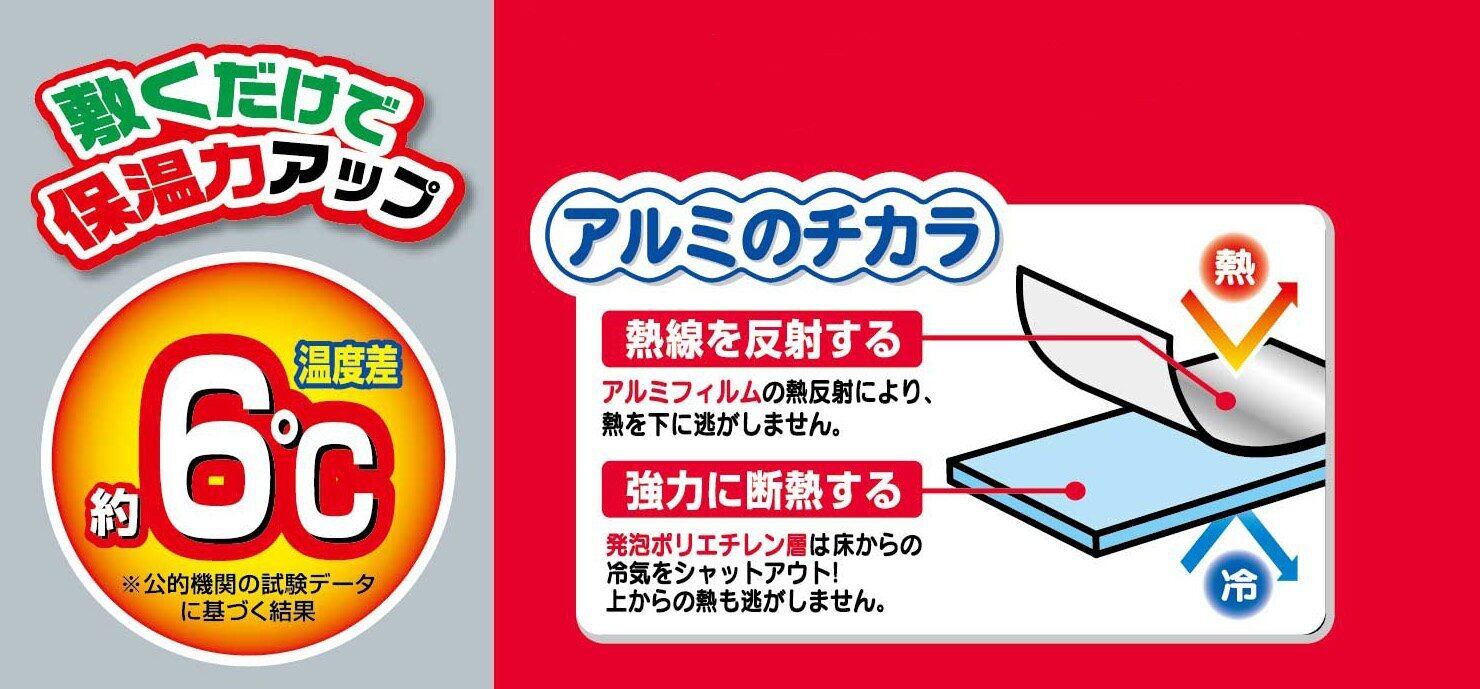 ●断熱効果の高い発泡ポリエチレンとアルミ蒸着フィルムのW効果で、床面からの冷気を防ぎ、熱を下に逃がしない