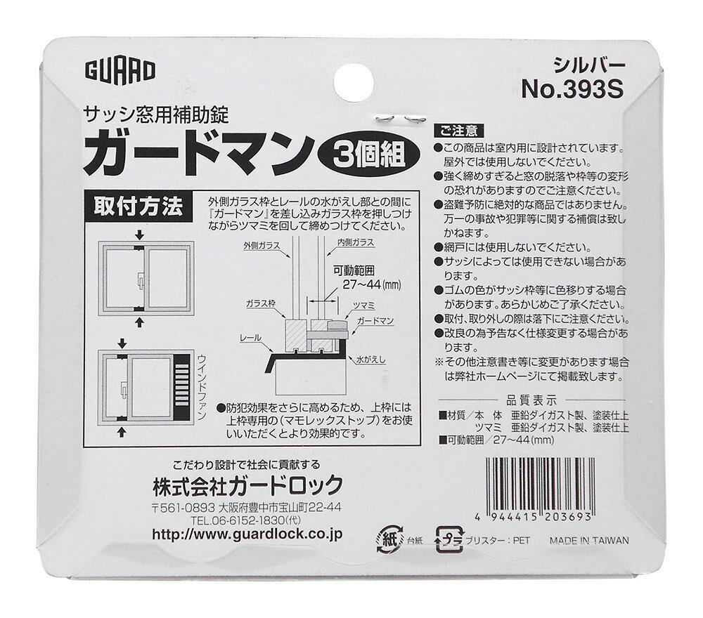 ガードロックサッシ窓用補助錠ガードマン3個組シルバーNo.393S