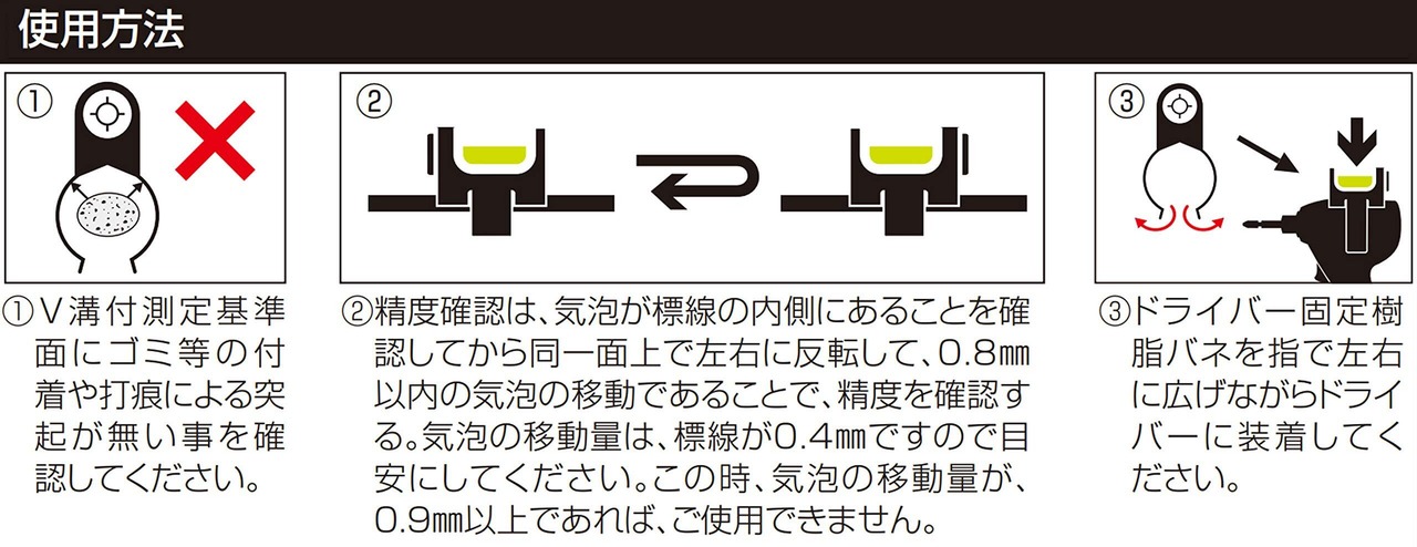 インパクトドライバに装着して使用することで水平、鉛直の測定をすることができます。