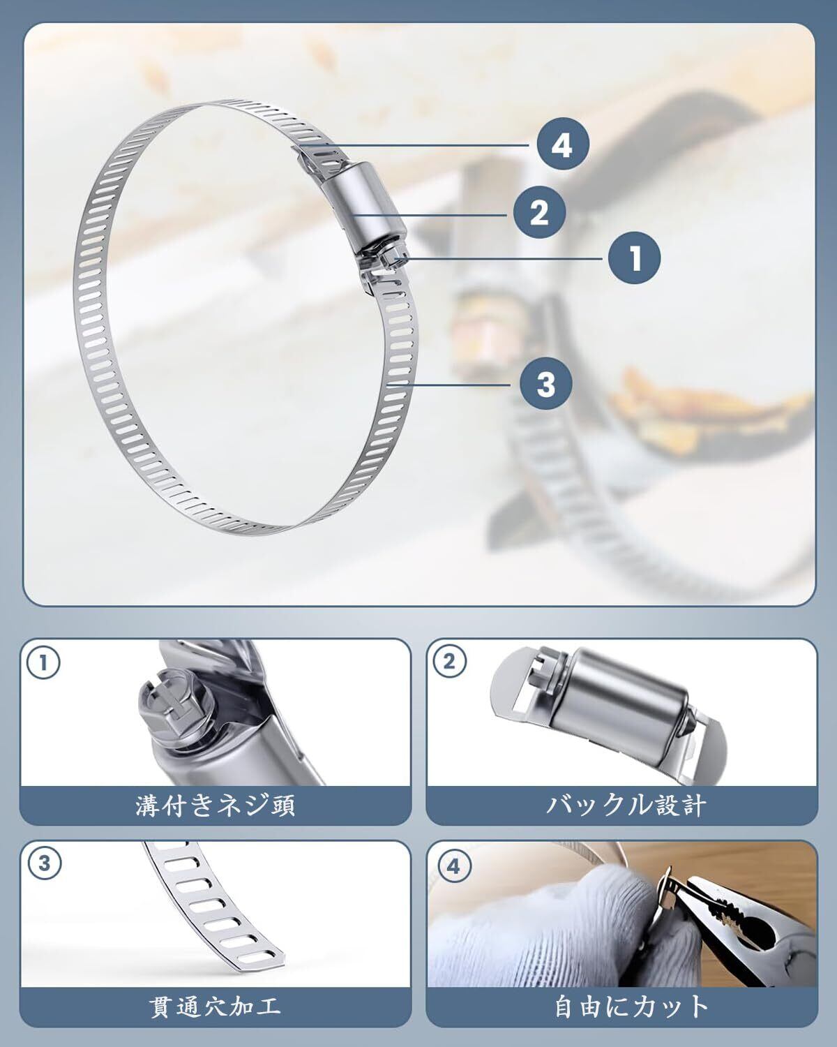 長さ調節可能なホースバンド ステンレスは、空気、液体、油のホースの接続に使用できます。ホースの接続以外にも、照明や監視カメラなどをポールに固定したり、屋外ボックスのポール固定ストラップとしても使用できます。車、バイク、店舗、工場など様々な場所でご使用いただけます