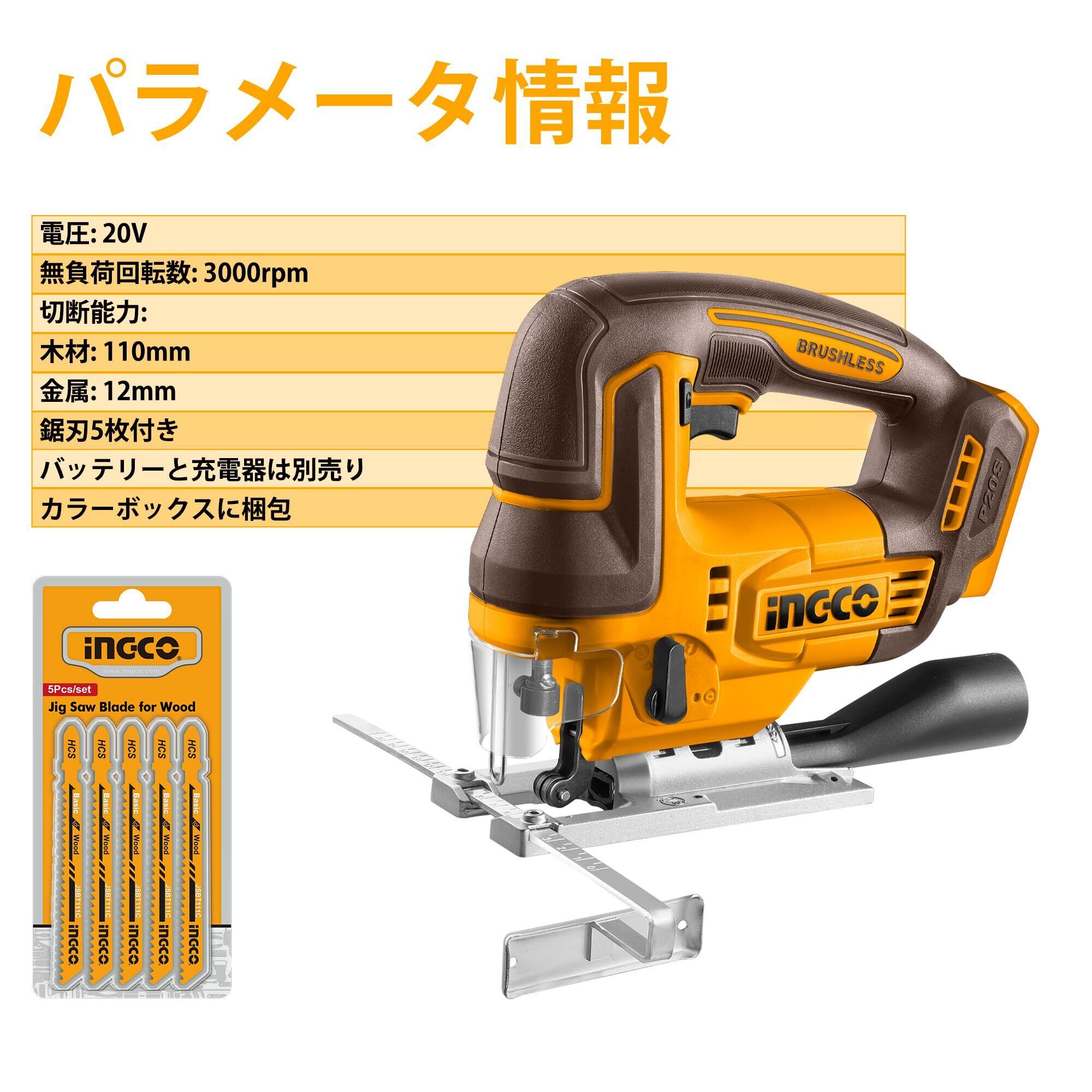 INGCO充電式ジグソー(本体のみ)20V 木工切断 直線曲線傾斜切断 コードレス 電動 ブレード5枚組付き CJSLI1008