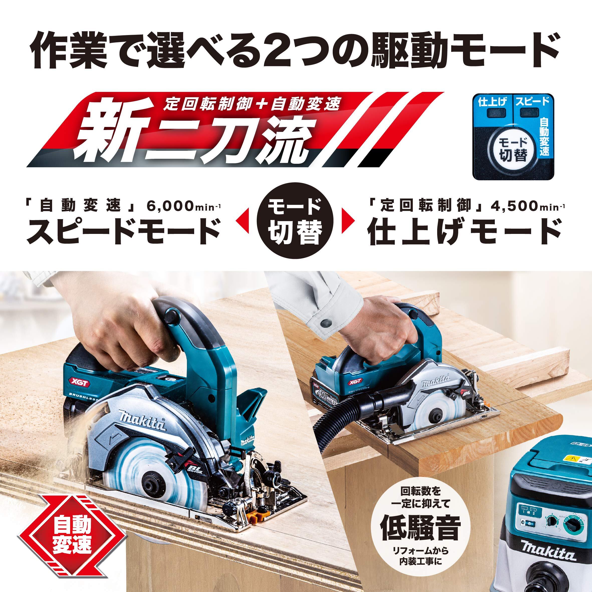 「新・二刀流」作業で選べる2つの駆動モード/「スピードモード」自動変速機で軽負荷時は高速回転、重負荷時は高トルクでスピーディ。「仕上げモード」定回転制御で、粘り強さとキレイな切断面を実現。低騒音でリフォーム現場や内装工事にも最適。