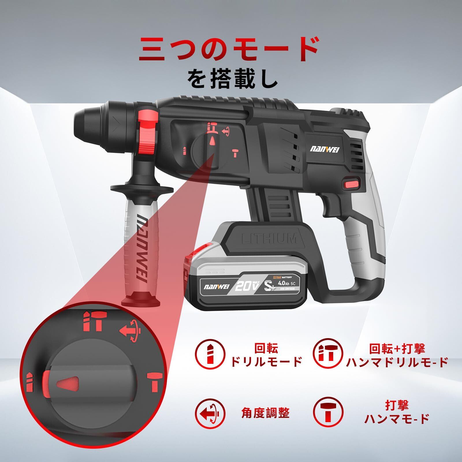 NANWEI 充電式ハンマードリル マキタ18Vバッテリー対応 ブラシレスモーター SDSプラス コードレスハンマードリル 正逆転 無段変速振動ドリル 3モード切替 石材・壁・金属・木材の穴あけ ハツリ(斫り)工事 (4.0Ah電池セット)