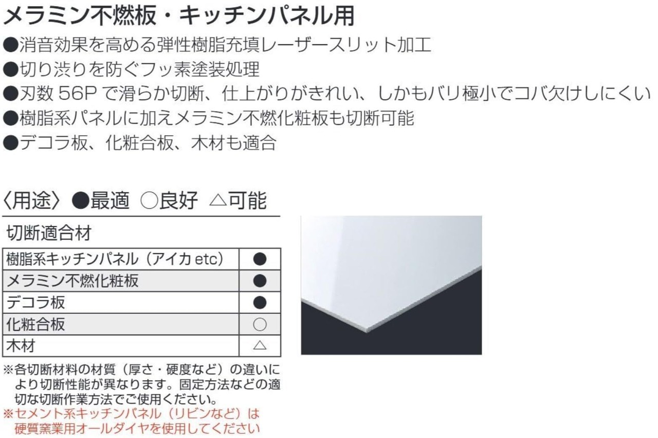 ●消音効果を高める弾性樹脂充填レーザースリット加工を行っています。●刃数56Pで滑らか切断、仕上がりがきれい、しかもバリ極小でコバ欠けしにくいです。●樹脂系パネルに加えメラミン不燃化粧板の切断に適しています。●デコラ、化粧合板、木材も適合します。●キッチンパネル用。