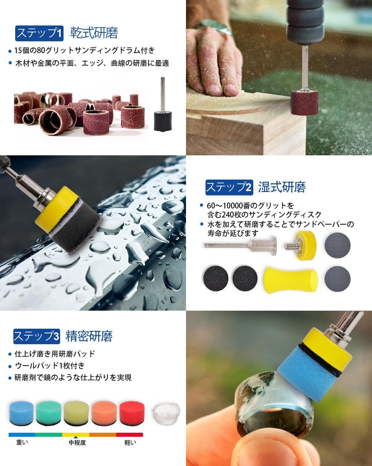 紙やすり セット: 金属、樹脂、木材、鏡、ガラス、オパールの研磨に最適。サンディングバンドは木製品修復やネイルポリッシャーに対応。バフ ポリッシャーと研磨スポンジで滑らかな仕上がり。電動工具対応で手ヤスリより簡単。最大10000RPM、推奨2000RPM以下。