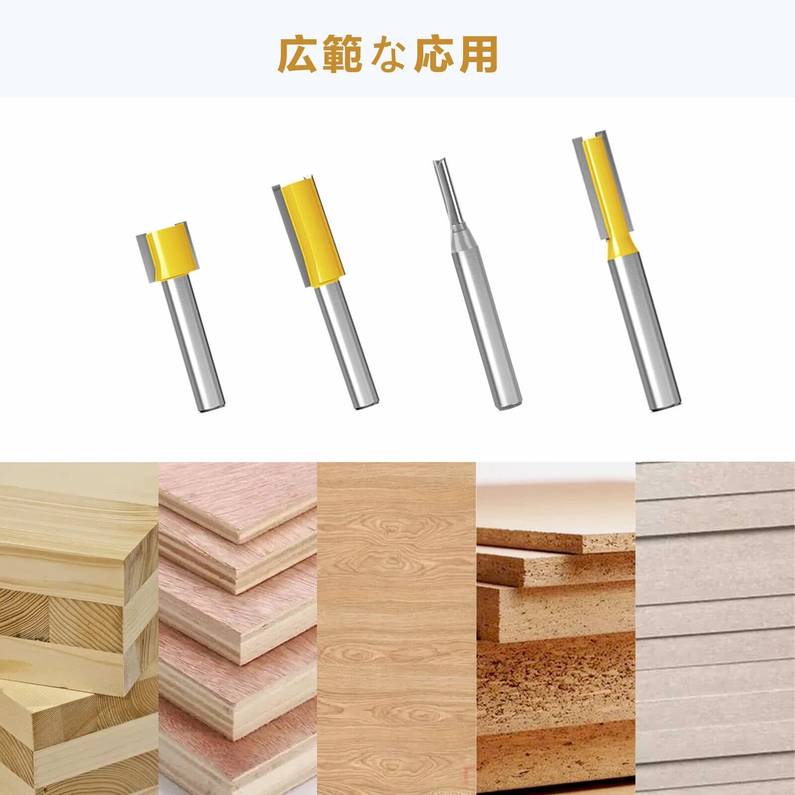 目地払いビットを含め使用頻度が高いビット6本を備え, 異なるサイズのペアリングを六つ付属します,交換により切り込みの深さ範囲が調整できます。