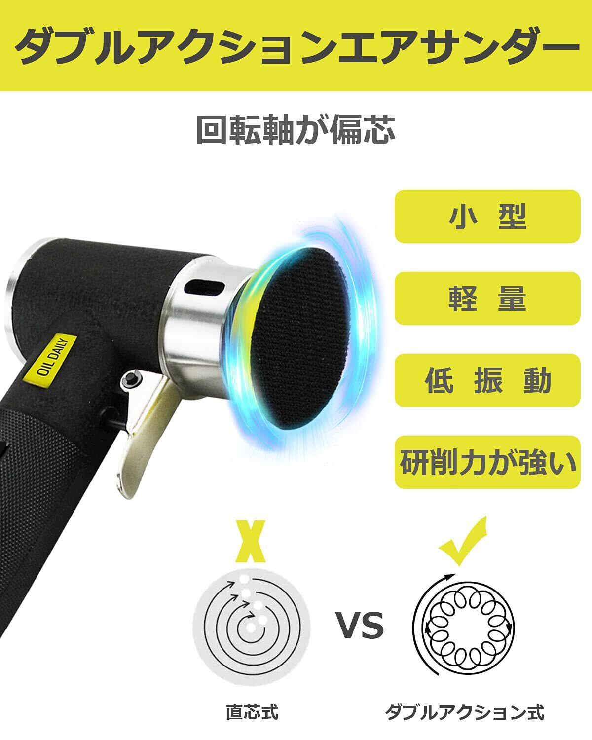 Anesty エアサンダー ダブルアクションエアサンダー 小型 回転軸が偏芯 ポリッシャーエアサンダー ポリッシャー オービタルサンダー ハンドサンディングツール 研磨パッド3サイズ ウールパッド9個、スポンジパッド15個 サンドペーパー30枚付き
