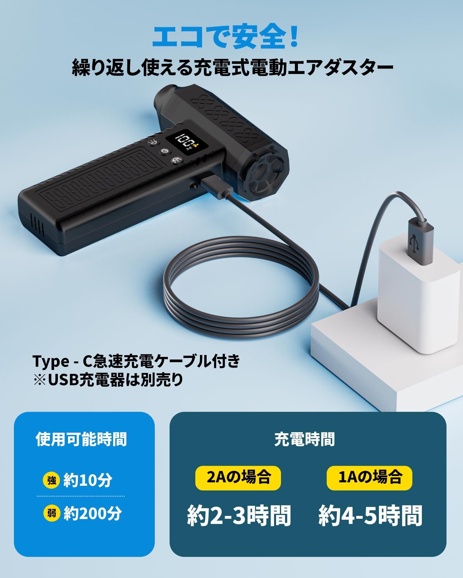 【3段階風量調整&10000mAh 大容量】風量は利用シーンに合わせてお好みの強さに調整出来る3段階調整タイプです。また、逆さでも噴射できるため、さまざまな角度から掃除できるのです。キーボードの隙間やパソコンの通風孔など、通常の掃除道具では届かない細かい部位の掃除に使用します。片手でも持ちやすいながら、超強噴射でホコリを楽々吹き飛ばせ。10000mAh超大容量バッテリーで、200分(ソフト風モード)程度の連続使用が可能。Type-C 急速充電で2-3時間にフル充電。