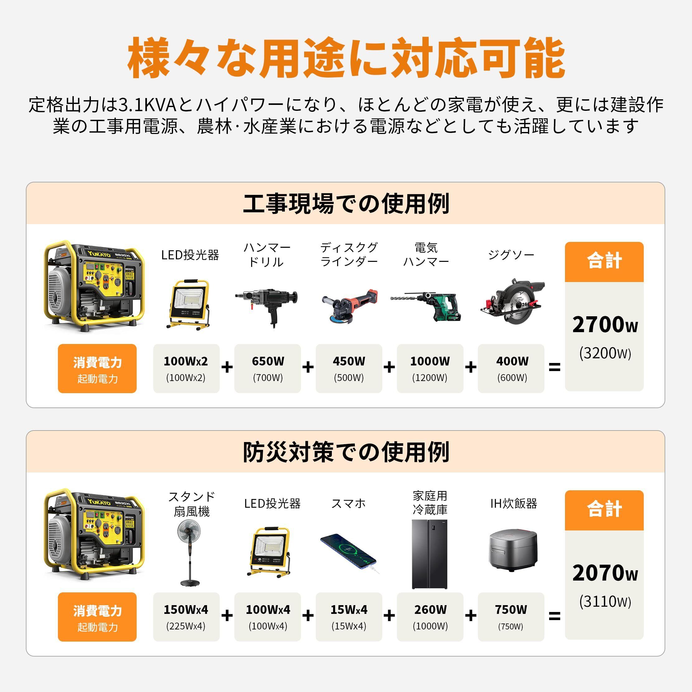 YUKATO インバーター発電機 定格出力3.1kVA 高性能 静音 50Hz/60Hz 切替 ガソリン発電機 オープン型 PSE認証 正弦波 並列使用可能 高出力 軽量 長時間連続運転 工場・現場用商品 工事用品 地震 災害 停電 アウトドアに適用