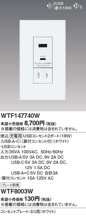 パナソニック(Panasonic) コスモシリーズワイド21 埋込充電用USBコンセント2ポート 18W USB-A・C 扉付コンセント付 ホワイト WTF147740W
