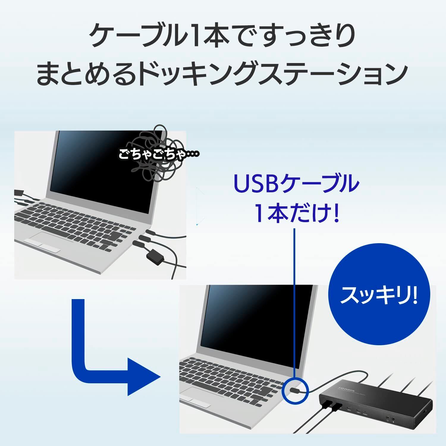 ■特長:USBケーブル1本で、パソコンも充電できる! 高解像度ディスプレイや様々な周辺機器がつながるドッキングステーション ■対応機種:USB 3.2 Gen 1(USB 3.0)/USB 2.0 USB Standard Aコネクター、または同仕様のUSB Type-Cコネクターを搭載したWindowsパソコンまたはMac製品、Chromebook ■サイズ/重量:約223(W)×80(D)×26(H)mm/約370g ■付属品:ACアダプター、電源コード(PSE適合品)、USBケーブル(A-C USB 3.2 Gen 1(USB 3.0)約1m)、USBケーブル(C-C USB 3.2 Gen 1(USB 3.0)約1m)、取扱説明書