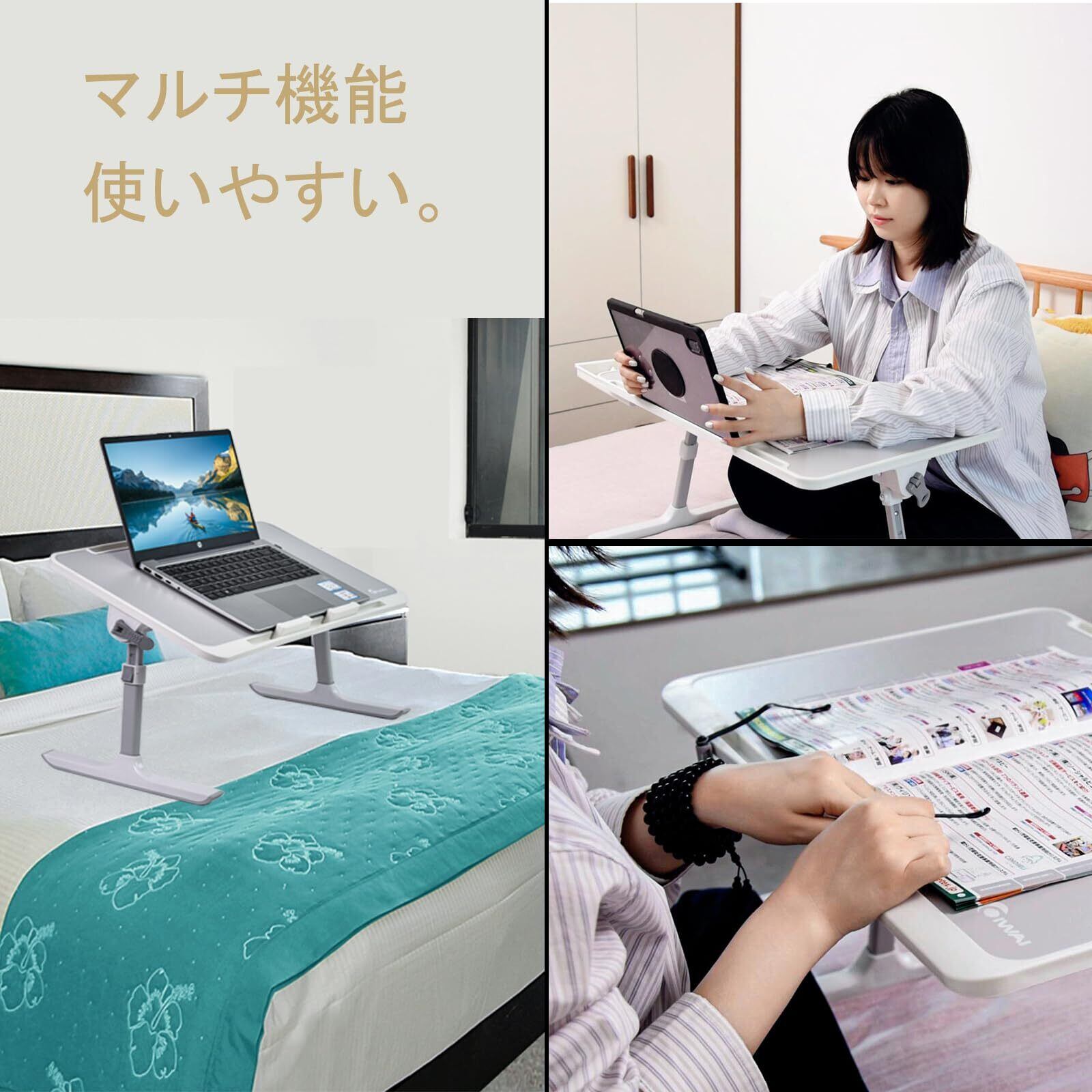 【マルチ機能】 ベッドテーブル、ノートPCスタンド、 ブックスタンド、昇降式折りたたみローテーブル 、タブレット/スマホスタンド、ベッド、ソファー、カーペットなど様々なシーンで活躍する多機能テーブル