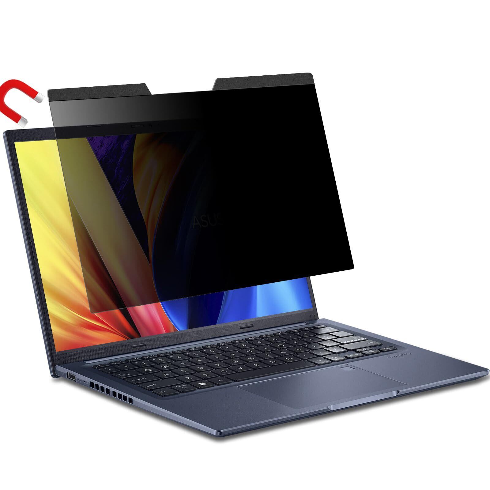 ■【プライバシー保護】視野角 60度、正面から見れると画面はクリアでも、隣の席からは真っ暗に映る偏光性を有する「覗き見防止フィルター」です。【対応機種】14インチ 縦横比16:10 寸法:フィルター部分のみ 301×188mm(縦幅/横幅のばらつき:+/-1mm程度)。上部の黒いマグネット部分は約9mm。画面とベゼルの高低差により画面がややぼやけて見える場合が御座います。
