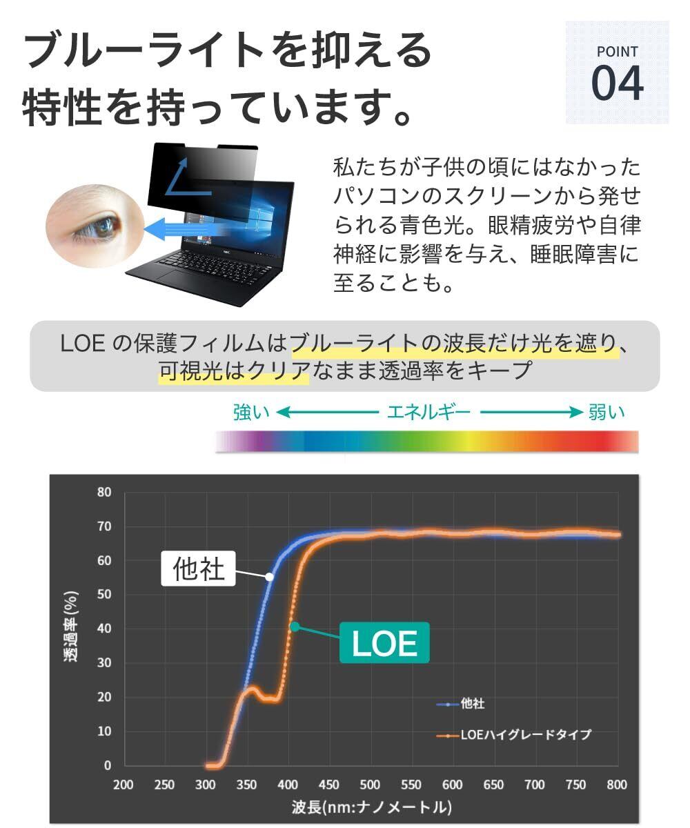 ブルーライトカット 私たちが子供の頃にはなかったノートパソコンのスクリーンから発せられる青色光。 毒性の強いブルーライトは眼精や体内リズムへの影響が益々懸念されています。 本製品は覗見防止効果を有しながら、ブルーライトを約53%低減します。紫外線カット率も98%と将来のことを考えるならブルーライトカット対応フィルムがオススメです。